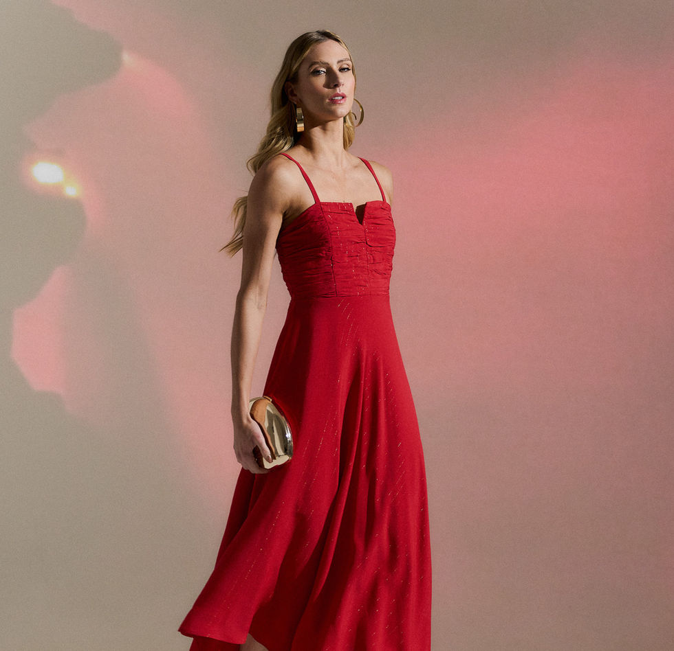A intensidade do vermelho ilumina o ambiente e se transforma no tom marcante da temporada. Entre conversas e movimentos, surgem vestidos longos e fluidos que acompanham o ritmo da festa, traduzindo feminilidade e sofisticação em cada passo.